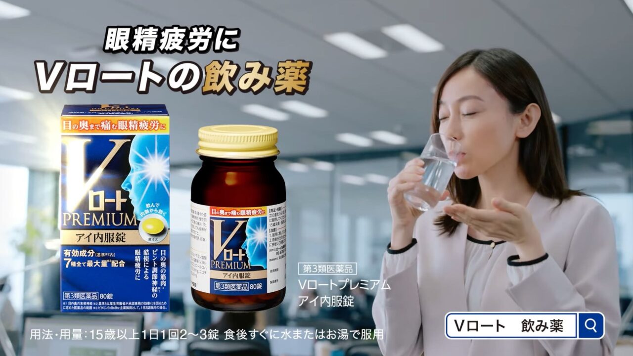 眼精疲労を感じる女性が「Vロートプレミアム」を飲むCMです。